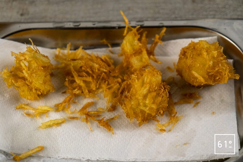 C’est un peu long à préparer donc voici notre conseil : lorsque vous allez réaliser les boules de pommes de terre râpées, elles vont relâcher pas mal de jus, donc il faut bien les compresser et les déposer immédiatement sur une araignée pour les plonger dans un bain de friture à 180 °C.