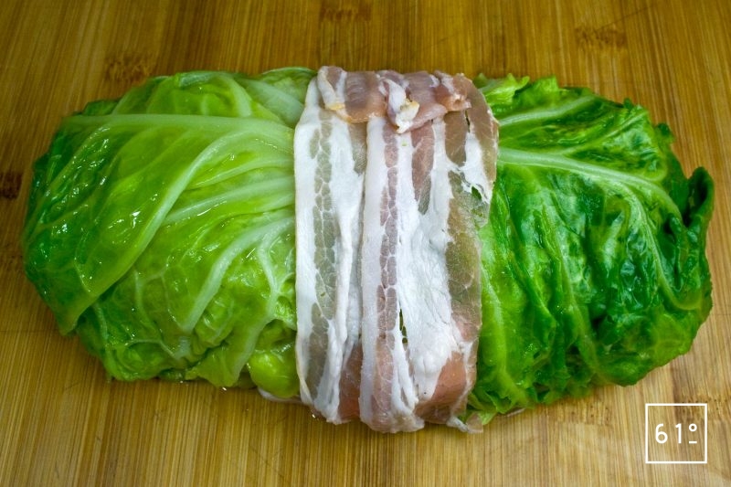 Après quelques essais, nous avons compris l’intérêt d’ajouter autour de la farce une fine tranche de viande tendre, afin de constituer une couche à la texture surprenante juste avant les feuilles de chou, qui retiendra les saveurs contenues dans la farce au moment de la cuisson. De même, la création d’un cœur de légumes apporte un contraste intéressant de saveurs et textures rendant l’ensemble plus chaleureux.